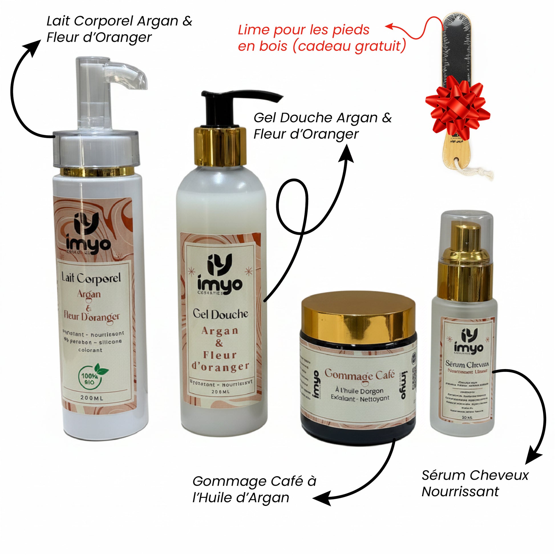 Gel Douche Argan & Fleur d’Oranger : Nettoie en douceur et hydrate la peau.